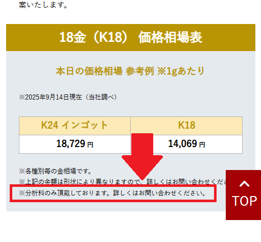次にチェックしてほしいのが、1gあたりの買取価格です。多くの買取業者は公式サイトや店頭で、K24・K18など純度ごとに「1g=○○円」といった形で単価を公開しています。