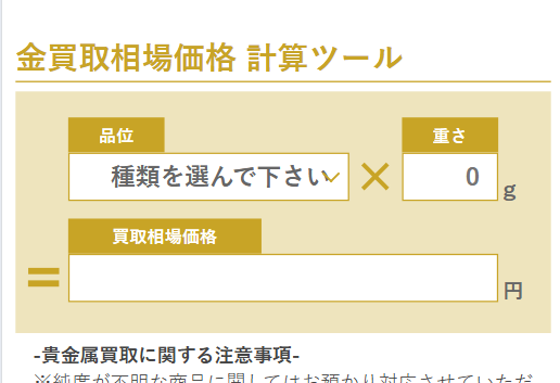 また、近年では買取店が公式サイト上に、シミュレーションができる計算ツールを用意している場合もあります。純度と重量を入力するだけで、自動的におおよその買取金額を算出してくれるので、手軽に目安を確認できます。