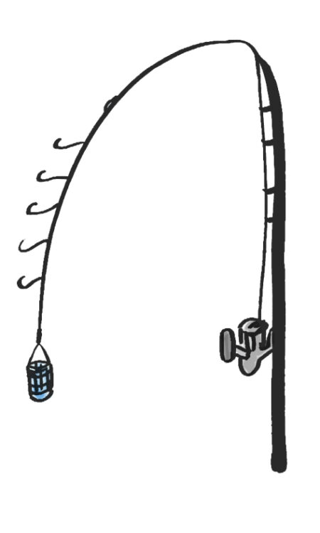 仕掛けの末端にクリップが取り付けられていることが特徴。子供でも簡単にセッティングできます。エサカゴにアミエビなどを入れて、撒き餌をすることで、多くの魚をおびき寄せられるため、他の釣り方に比べて魚が釣れやすいことが魅力です。