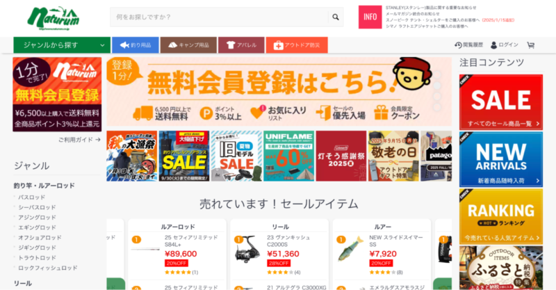 ナチュラムは、釣具とアウトドア用品に特化した老舗通販サイトです。特にルアーやリールなどのジャンルで強みがあり、限定商品やコラボ商品も多数販売しています。